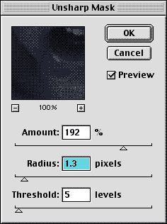 One of the niftiest filters in Photoshop is the Unsharp Mask filter (Filter>Sharpen>Unsharp Mask). Scanning introduces a slight blur to an image and the Unsharp Mask filter magically sharpens the image back to the way it was.