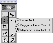 The Magnetic Lasso Tool is quite handy for selecting items along a high contrast border. The tool works by clicking where you want the selection to start (you don't need to hold down the mouse button as you draw) and then dragging along the high contrast line. The computer (more or less) automatically calculates where the line should be drawn. As you draw, anchor points are placed down at certain intervals to keep the line in place.