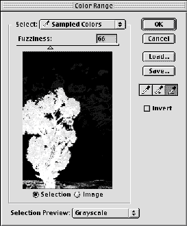 Another way to select color within an image is through the Select>Menu>Color Range menu. This is basically like the Magic Wand Tool on steroids. Selecting Color Range from the menu brings up the dialogue box shown on the right. To select a color click on the color you want to keep with the eyedropper. If you want more colors to be added, click the Add Color eyedropper until the selected area appears the way you want it. The Fuzziness slider is basically like the Tolerance setting of the Magic Wand Tool. The lower the Fuzziness setting, the more closely the selected color must match. You can see the results of selecting a few colors from the tree and how the sky was eliminated. It took me about 30 seconds to create this fairly complex selection.